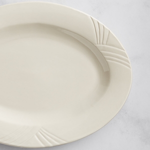 - Item #: 303ivsp1378Acopa Swell 13 7/8" x 10 1/2" Ivory (American White) Embossed Wide Rim Oval Stoneware Platter - 12/Case