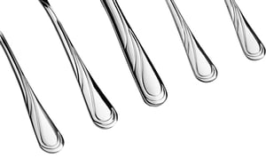 This set has everything you need to serve up multiple courses to your customers, including (12) teaspoons, (12) bouillon spoons, (12) dinner forks, (12) dessert forks, and (12) dinner knives. This complete set has a versatile design that is perfect for bistros, cafes, and catered events.