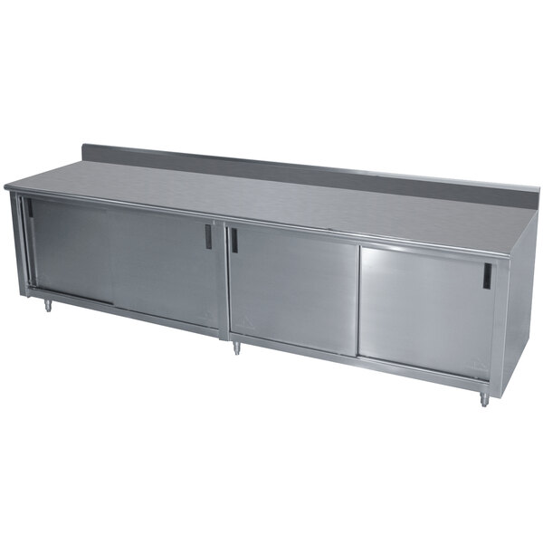 This 30" x 144" Advance Tabco CK-SS-3012 enclosed base work table with 5" backsplash combines a durable work surface with concealed storage to keep mixing bowls, containers, prep supplies or even small kitchen appliances close at hand!
