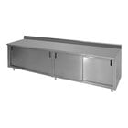 The Advance Tabco CK-SS-308M enclosed base commercial work table's sliding doors feature recessed handles for easy opening and closing. It can support up to 500 lb. of evenly distributed weight.