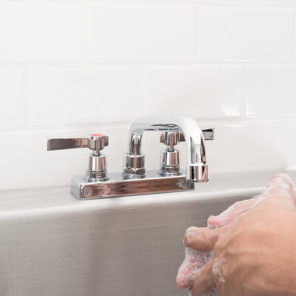 - Deck mounted swing spout faucet included