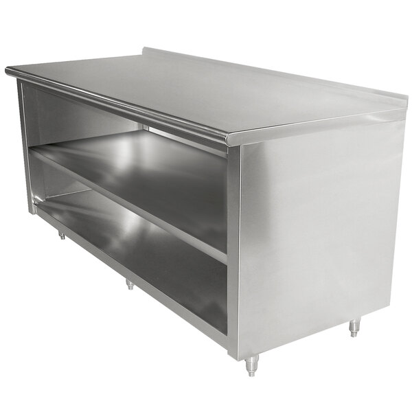 This 36" x 96" Advance Tabco EF-SS-368M open front cabinet base work table with 1 1/2" backsplash blends a heavy-duty work surface with storage space that's enclosed on three sides plus a convenient fixed mid shelf to keep mixing bowls, containers, prep supplies or even small kitchen appliances close at hand!