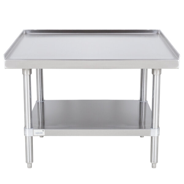 The heavy duty Advance Tabco ES-243 24" x 36" stainless steel equipment stand with stainless steel undershelf is built to stand tough in the busiest commercial kitchens! It has a rugged, 14 gauge type 304 stainless steel top with a 1" hemmed splash on the rear and sides, and a v-edge front that helps contain spills. This durable 24" x 36" equipment stand features stainless steel legs with matching bullet feet, and an adjustable stainless steel undershelf for optimum strength and flexibility.