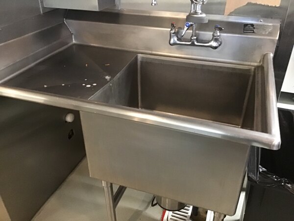 An 8 1/2" high backsplash with tiled edge enables simple installation, and two holes punched on 8" centers will accommodate a faucet (sold separately). The front and sides of this one compartment stainless steel commercial sink with one drainboard each have 1 1/2" rolled edges to help contain splashes and overflow. The compartment features coved corners for simple cleaning, and is 14" deep with a 1 1/2" drain.