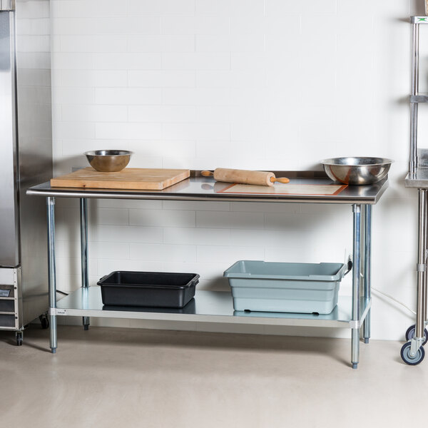 This work table's top shelf is made of 16 gauge type 430 stainless steel for long-lasting, dependable service life. It features an easy-to-clean rolled front, and the sides of the table are squared off for flush placement against walls or other tables. It also features a sound-deadened top to help keep loud noises from disturbing your customers. A 1 1/2" backsplash prevents items from falling behind the table, while also protecting your walls from splashes for more sanitary conditions. Plus, the top shelf boasts a weight capacity of approximately 420 lb.