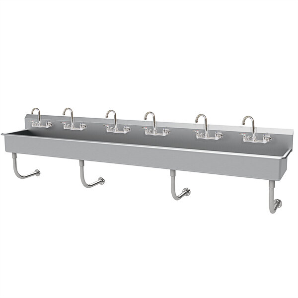 This Advance Tabco FS-WM-120-F multi-station stainless steel hand sink is a great way to make hand-washing easy in busy workplaces. The sink bowl measures 117" x 16" x 8" deep, with (3) 3 1/2" rear drain baskets to make filling and emptying the sink easy. An 8 1/2" high backsplash protects your walls from moisture and debris, and it comes with 6 gooseneck faucets with 8" centers so that you can start using it right away.