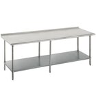 As part of the Advance Tabco Premium Series, this FSS-309 30" x 108" commercial work table presents a strong, corrosion-resistant 14 gauge type 304 stainless steel top, in addition to a convenient, 18 gauge stainless steel undershelf, offering ample storage capacity. Its smooth, satin-finished top features a 1 5/8" sanitary rolled front edge with square sides and a 1 1/2" backsplash, ideal for use in food preparation and ware washing areas.