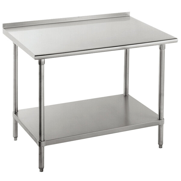 As part of the Advance Tabco Premium Series, this FSS-363 36" x 36" commercial work table presents a strong, corrosion-resistant 14 gauge type 304 stainless steel top, in addition to a convenient, 18 gauge stainless steel undershelf, offering ample storage capacity. Its smooth, satin-finished top features a 1 5/8" sanitary rolled front edge with square sides and a 1 1/2" backsplash, ideal for use in food preparation and ware washing areas.