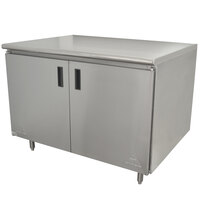 This Advance Tabco HB-SS-364M 36" x 48" stainless steel work table offers plenty of enclosed space to store equipment, and is built to stand tough against the rigid demands of the busiest kitchens! A fixed midshelf is included to promote optimum storage flexibility, while the work table's 14 gauge type 304 stainless steel top and 18 gauge type 430 body are supported by stainless steel legs and matching bullet feet. The back and sides form a unibody design for optimum rigidity, while the double-panel hinged doors boast recessed inner panels for additional support.