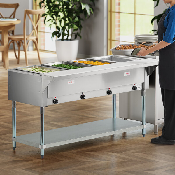 The Advance Tabco HF-4-E Four Pan Electric Steam Table with Undershelf-Open Well is working great. We had to replace the electrical cord because we did not have the right outlet for this table. The table fits our nutrition site perfect. Very easy to operate and clean.