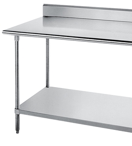 The 36" x 48" sound-deadened top shelf is made from 16-gauge, type 304 stainless steel and supports approximately 480 lb. of evenly distributed weight. It features an easy-to-clean rolled front, and the sides of the table are squared off for flush placement against walls or other tables. To support the weight on top and maintain a level work surface, this work table is engineered with three reinforcing hat channels. Additionally, this table has a 5" backsplash to protect your walls from water, grease, and food debris.