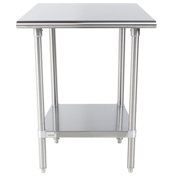 For superior quality and lasting durability, use this Advance Tabco Premium Series SS-300 30" x 30" stainless steel commercial work table with stainless steel undershelf. It's constructed of a heavy duty, corrosion-resistant 14 gauge type 304 series stainless steel work surface, accented by rolled front and rear edges, with square sides.