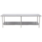 This 36" x 108" stainless steel work table offers a convenient, adjustable 18 gauge stainless steel undershelf, held securely in place by die cast leg clamps. For further stability, each table includes 1 5/8" diameter tubular stainless steel legs, each with a 1" adjustable stainless steel bullet foot. It can support up to 675 lb. of evenly distributed weight.