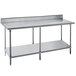 Each commercial work table with undershelf and 5" backsplash offers 1 5/8" diameter tubular stainless steel legs with stainless steel bullet feet. It can support up to 500 lb. of evenly distributed weight.