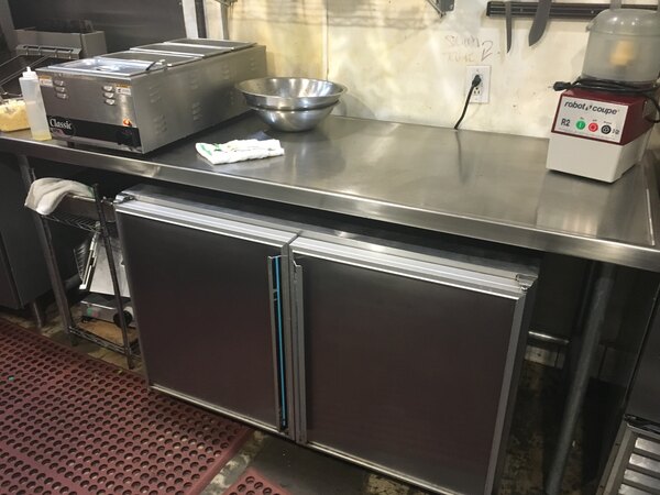 VERY sturdy and durable prep table. We hold our steam table and panini press on it, as well as use it for extra prep space.