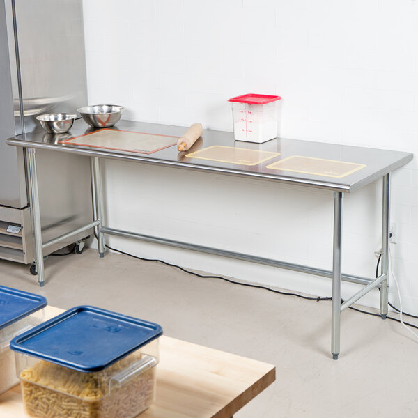 For superior balance, this table boasts legs with 3" gussets rather than the standard 2" gussets found on other tables. Plus, the tabletop includes grooved, roll formed hat channels to provide maximum strength and durability. Plus, its open base design allows you to roll bins or store equipment undeneath!
