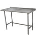 This Advance Tabco TFLAG-303 30" x 36" 16-gauge 430 stainless steel economy work table with 1 1/2" backsplash and galvanized legs is an economical option for your commercial food prep area! It's perfect for completing all kinds of daily tasks, from chopping up vegetables to kneading dough, pressing hamburger patties, and boxing up baked goods. The table is able to support approximately 390 lb. of uniformly distributed weight, and it's also sound-deadened to help keep loud noises from disturbing your customers. It features easy-to-clean, rolled front and rear edges, and the sides of the table are squared off for flush placement against walls or other tables. A 1 1/2" backsplash helps protect your walls from splashes and spills.