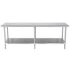 As part of the Advance Tabco Standard Series, this TMS-248 24" x 96" stainless steel commercial work table offers the durability of strong, yet affordable, 16 gauge type 304 stainless steel that's exceptionally corrosion resistant with the convenience of an open base design for ingredient bins and more! Its smooth, satin-finished design features rolled front and rear edges, with square sides to keep your staff safe when moving throughout your facility.