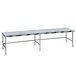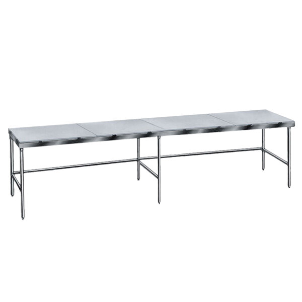 The 24" x 108" open base Advance Tabco TSPT-249 poly top work table provides a sturdy, convenient prep area for any commercial kitchen. Thanks to its 5/8" thick poly cutting board, you can complete a variety of prep tasks like chopping vegetables or butchering meat without fear of damaging your knives. It features a heavy-duty 12 gauge type 304 stainless steel frame and support members. The 12 gauge steel offers a durable surface for intensive tasks, and its type 304 construction provides superior corrosion resistance, perfect for damp or humid environments.