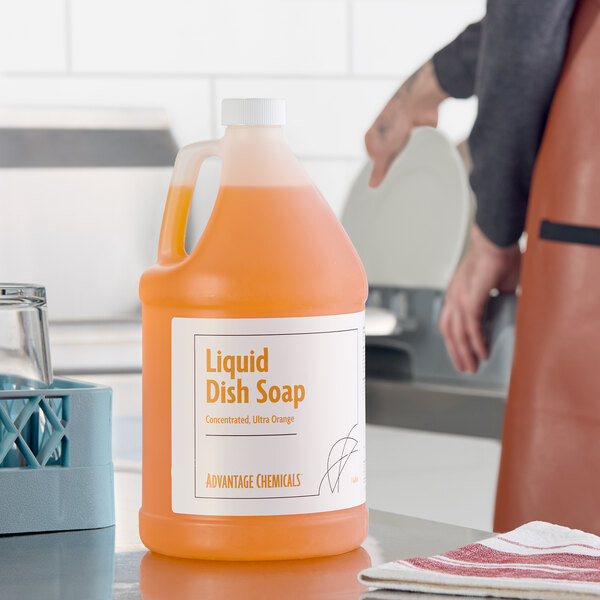 This Advantage Chemicals 1 gallon ultra citrus concentrated liquid dish soap will ensure your pots, pans, flatware, and dishes are sparkling clean! Not only does it have a high-sudsing formula to easily cut through grease, dirt, and food build up, it also has a pleasant ultra citrus scent and is gentle on hands. It boasts a heavy-duty formula that removes lipstick from glassware without the need for scrubbing and won't leave any leftover residue that could affect the foaming head on beer.