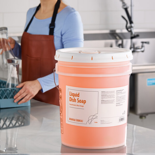 This Advantage Chemicals 5 gallon / 640 oz. ultra citrus concentrated liquid dish soap will ensure your pots, pans, flatware, and dishes are sparkling clean! Not only does it have a high-sudsing formula to easily cut through grease, dirt, and food build up, it also has a pleasant ultra citrus scent and is gentle on hands. It boasts a heavy-duty formula that removes lipstick from glassware without the need for scrubbing and won't leave any leftover residue that could affect the foaming head on beer.