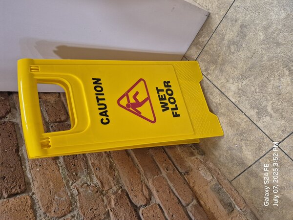 This wet floor sign features an A-frame design that allows for quick and easy setup. An integrated handle makes it easy to carry the sign to any area in your facility. Once the floor has dried completely, the sign collapses to fold flat so that it can easily be stored in tight areas.