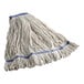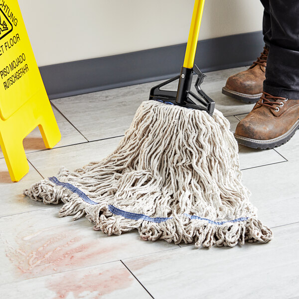 Good, cheap mop head that we use at our coffee shop. They do a decent job cleaning the floors and the actual head cleans up great in a laundry machine with some bleach. The middle band makes securing to a handle easy and quick!