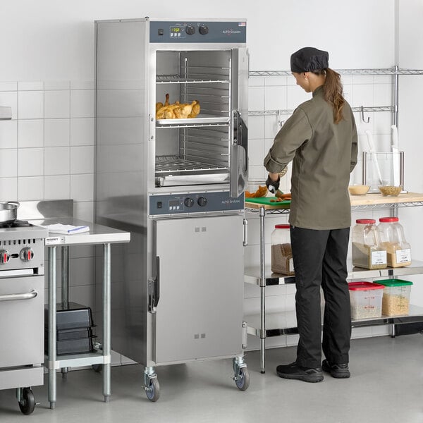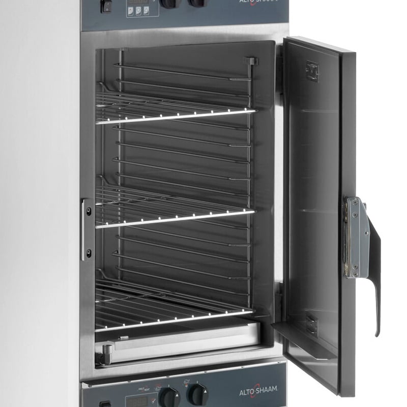 The versatile, easy-to-use Alto-Shaam 1000-TH-I cook and hold oven cooks, roasts, re-heats, and holds food for delicious, consistent results every time! Its two-door design means that you'll have two individually controlled compartments so you can cook different products simultaneously. This heavy-duty model features a durable 22 gauge stainless steel exterior.