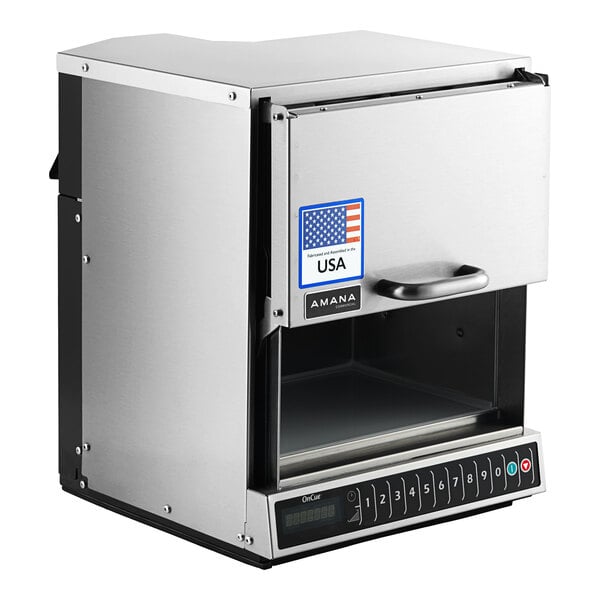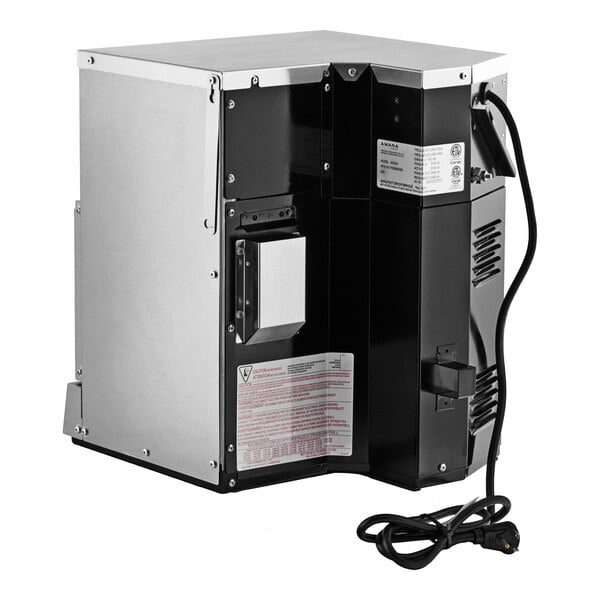 The unique door design of this 2400W heavy-duty Amana commercial microwave automatically opens when the cooking cycle is complete, for easy access.