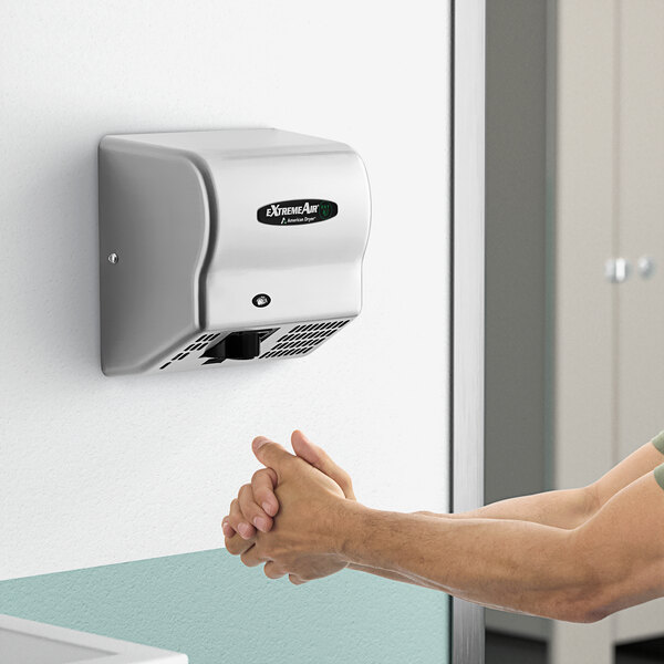 The American Dryer ExtremeAir hand dryer offers a way for employees and customers to dry their hands quickly and efficiently! The automatic, hands-free sensor detection and an antimicrobial-infused air delivery system improve sanitation! Its sleek stainless steel cover provides added durability while seamlessly blending in with any restroom decor.