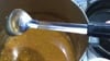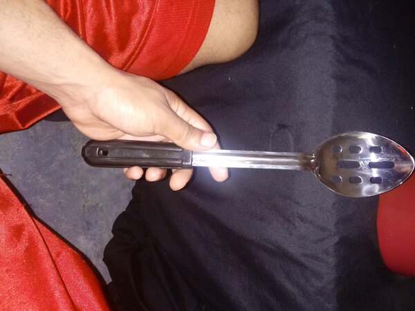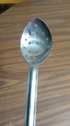 this perforated spoon works great for grabbing juicy dishes it has a plastic handle and the spoon is made out of stainless steel, it is very easy to clean