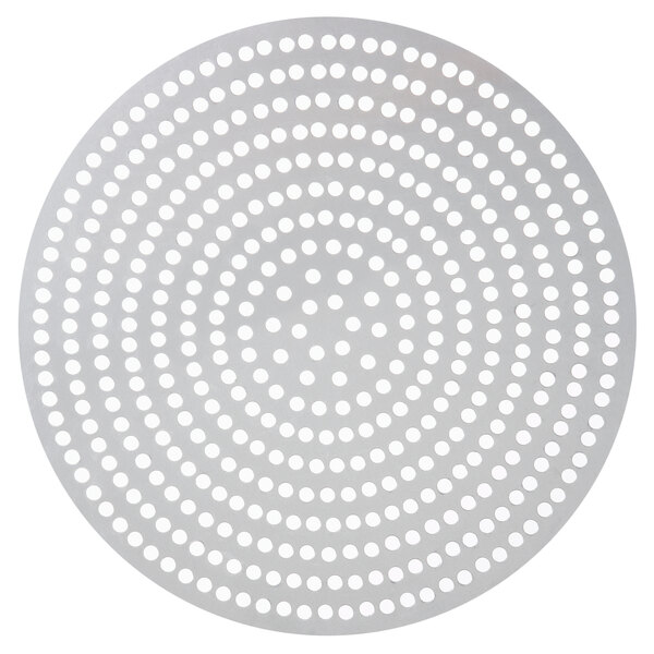 Bake and serve crispy, golden pizza crusts every time with this American Metalcraft 18919SP 19" super perforated aluminum pizza disk! This disk's super perforated design with 9.5mm (3/8") holes provides greater air circulation while pizzas are baking, resulting in a more evenly baked crust. Its construction also helps keep freshly baked pizzas fresher for longer, as the holes allow moisture to escape. Made of durable, 18 gauge standard weight aluminum, this disk resists rust, corrosion, and warping for your commercial kitchen's long-term use and enjoyment.