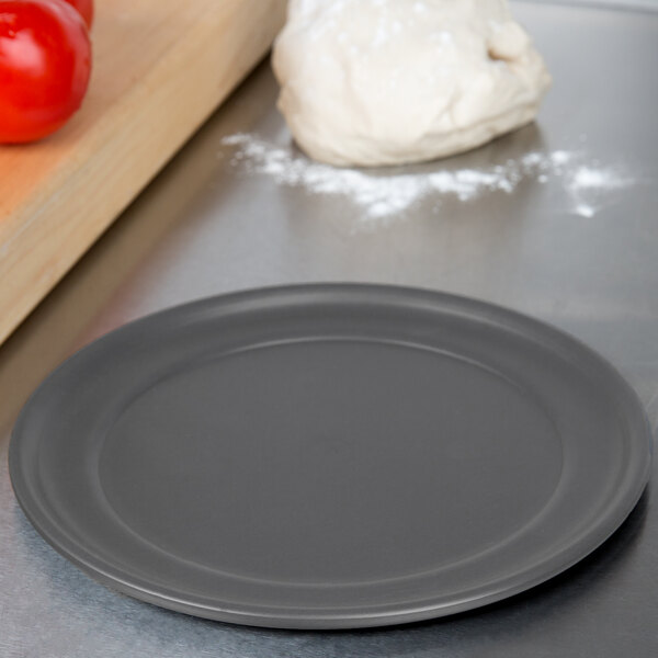 Ships free withBake and serve piping hot, topping-loaded creations on this American Metalcraft HCTP13 13" hard coat anodized aluminum wide rim pizza pan! Thanks to its durable 14 gauge, 1.5 mm thick hard coat anodized aluminum construction, this pan is built to withstand the wear and tear of everyday use in busy commercial kitchens. Plus, its wide rim makes it easier for you to handle and slice your specialty offerings before transporting them the front-of-house for serving!