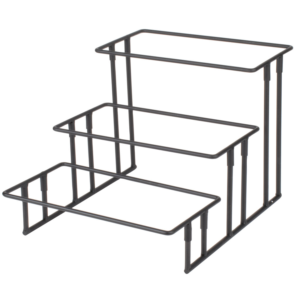 When space is of the essence, ensure that your creations aren't forgotten or overlooked by displaying them on this rectangular display stand! With three tiers made from black, wrought iron, this unit is the perfect combination of style and function and is sure to elevate your pastries, hors d'oeuvres, or finger sandwiches to the attention of all of your hungry guests and customers.