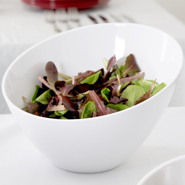 Blending the elegant look of porcelain with the unbeatable durability of melamine, this 3.5 qt. American Metalcraft MELSL112 Endurance slanted round bowl is perfect for serving salads, entrees, side dishes and more at your buffet or catered event! Its stunning slanted design brings a contemporary look, while its white body emphasizes your foods' freshness and vibrant colors.