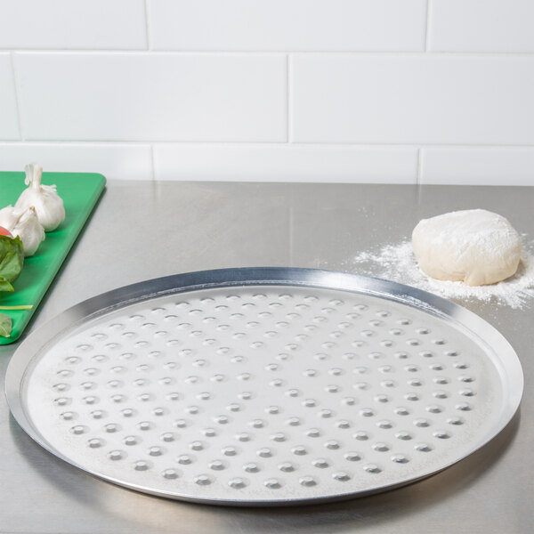 The bottom of this pan features nibs that are 5/8" in diameter and raise the pizza about 1/8" above the surface, allowing moisture to escape to yield a delicious, golden crust time after time. This pan is also easy to clean, owing to its one-piece construction. Whether you use it to bake specialty pizzas with adventurous toppings or traditional cheese, this item will bring quality at an economical cost, making it an essential addition to any pizzeria, restaurant, or buffet.