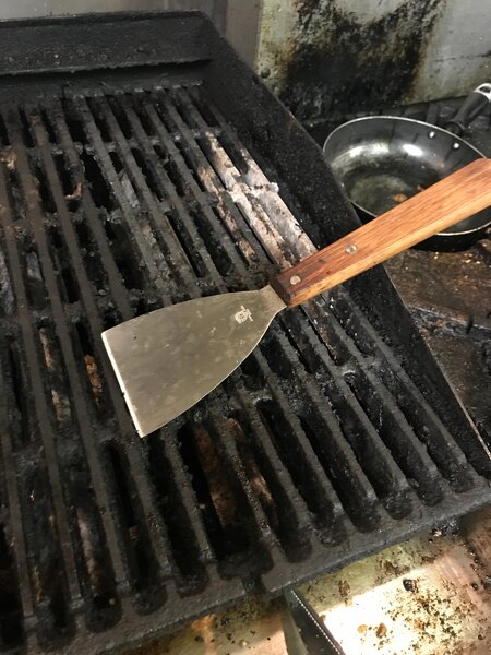 I really like the slanted edge stainless steel scraper it really gets good in the corners of the flat top to get out built up grease in that long handle really helps