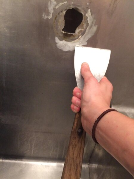 We use this slanted edge stainless steel grill scraper to scrape grit off of our griddle. I do not use this unit for directly touching food, for cleaning use only.