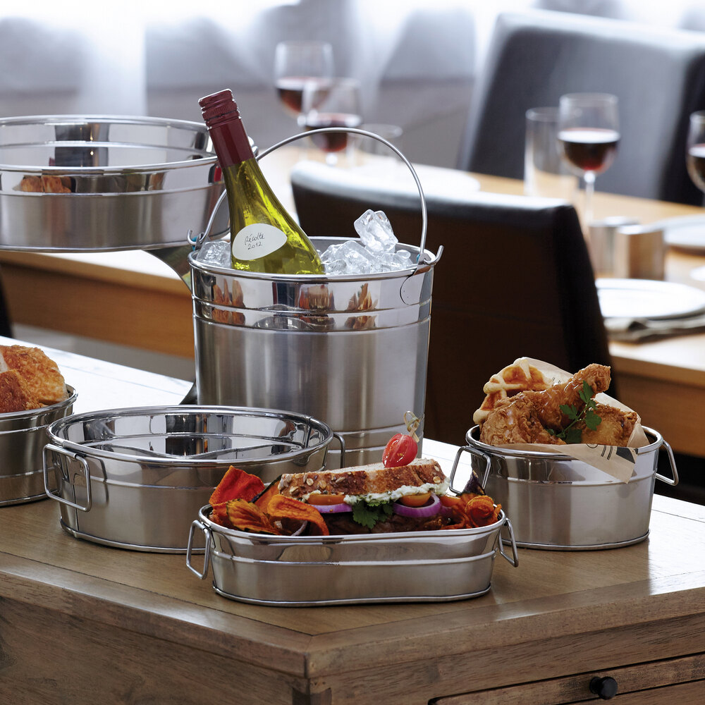 These round stainless steel tubs make for a very attractive condiment holder on our tables in our restaurant. They are large enough to hold everything you need on the table.