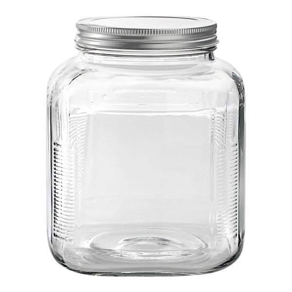 Keep your flour, pasta, coffee grounds, or tea safely stored in your kitchen with this Anchor Hocking 85725AHG17 1 gallon glass cracker jar! This jar is perfect for use in your restaurant kitchen. It can hold your cooking ingredients so that they are easily accessible. It features a screw top so that it will close securely and keep your food safe. The screw top is made of durable brushed metal that will last in your establishment.