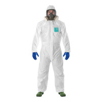 Keep employees protected with this Ansell AlphaTec® Comfort 68-2000C Model 177 white microporous polyethylene collared coverall with SMS back panel. This collared coverall offers protection against low concentration liquid chemicals and liquid and particulate biological hazards. It protects the arms, legs, and front torso. It is constructed of durable white microporous polyethylene laminate with an SMS polypropylene back panel. These materials offer superior breathability to prevent heat stress. This collared coverall is anti-static as tested to EN 1149-5 and AATCC 76 standards, and it is silicone-free for spray painting applications.