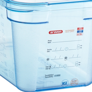 Featuring a molded in, integrated traceability label for proper identification and record keeping, this food pan ensures your ingredients and prepared foods are stored properly to adhere to food safety guidelines. The built-in label helps reduce costs and waste by replacing disposable food labels in your establishment. In addition, your staff will be able to identify contents at a glance and record information on food origins to ensure your kitchen complies with traceability regulations. Plus, the blue finish makes this food pan perfect for displaying food at cold counters.