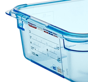 The transparent ABS plastic construction is durable and easy to clean for long-lasting use in your kitchen. Plus, it enables good product visibility, guaranteeing that you can easily identify its contents and quantities for refilling purposes. The standard gastronorm size is ideal for caterers and prep kitchens, and the capacity indicators allow for easy inventory management. Additionally, this item's smooth interior surface and rounded edges increase yields and enable quick, low-hassle cleanup.