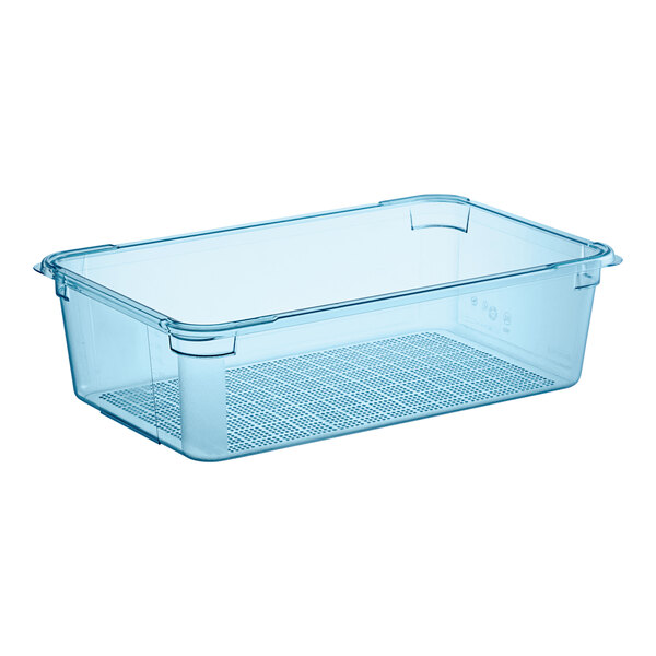 The transparent ABS plastic construction is durable and easy to clean for long-lasting use in your kitchen. Plus, it enables good product visibility, guaranteeing that you can easily identify its contents and quantities for refilling purposes. The standard gastronorm size is ideal for caterers and prep kitchens. Additionally, this item's smooth interior surface and rounded edges increase yields and enable quick, low-hassle cleanup.