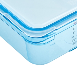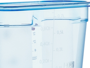 The transparent ABS plastic construction is durable and easy to clean for long-lasting use in your kitchen. Plus, it enables good product visibility, guaranteeing that you can easily identify its contents and quantities for refilling purposes. The standard gastronorm size is ideal for caterers and prep kitchens, and the capacity indicators allow for easy inventory management. Additionally, this item's smooth interior surface and rounded edges increase yields and enable quick, low-hassle cleanup.