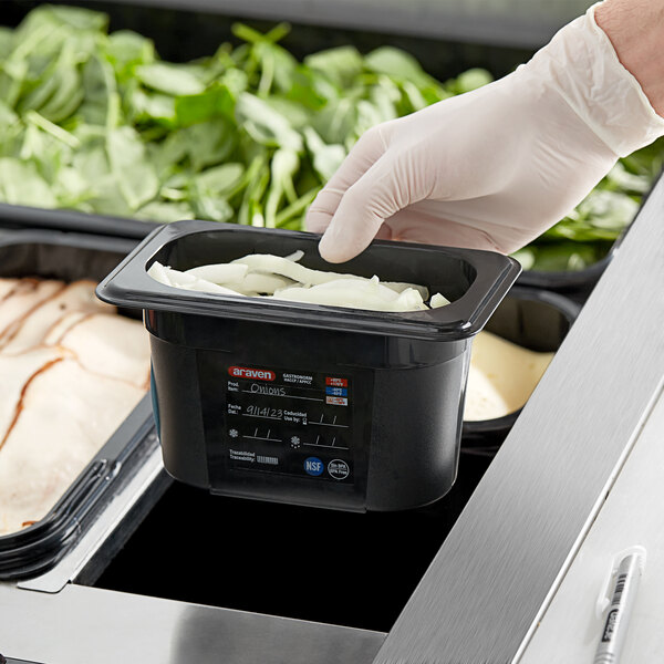 Easily store ingredients and keep them fresh with the help of this Araven 44011 1/9 size black ABS plastic food pan.