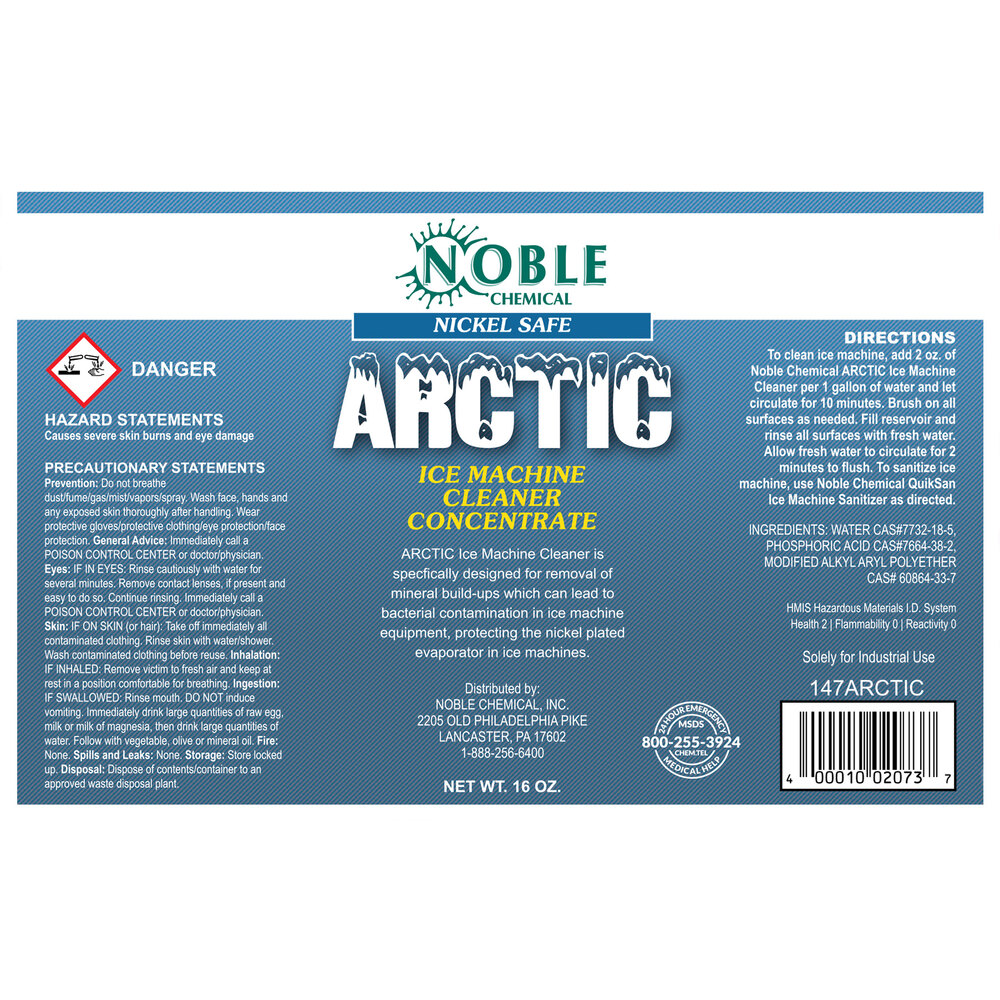 Noble Arctic ice machine cleaner is designed to remove mineral buildup from your commercial ice machine. Regularly cleaning your ice machine is crucial to avoiding bacterial contamination and also protects the equipment's evaporator. This product is safe for use with all ice machines and will protect both nickel and tin-plated evaporators.