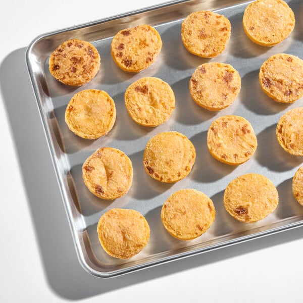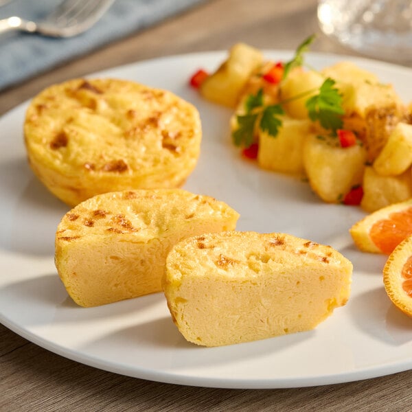 Capitalize on a new, trendy meal offering with these Artisan Kitchens three cheese egg bites! These protein-packed, 2.3 oz. egg rounds are made from farm-fresh, cage-free whole eggs blended with cheddar, monterey jack, and cottage cheese for a filling breakfast. Oven-baked, these healthy egg bites retain a firm, lusciously smooth egg texture with bursts of savory flavor from the three cheese blend. Plus, with only 230 calories for a serving of 2 egg bites, these egg bites are a perfect health-conscious meal or snack option at your eat-in or to-go restaurant.