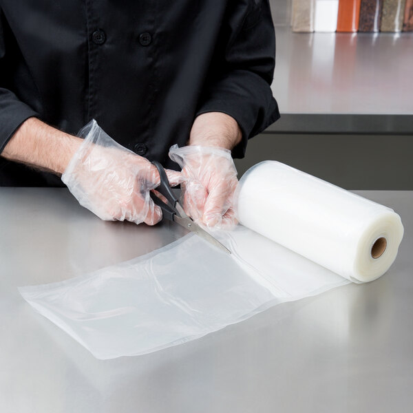 Using Vacmaster's full mesh technology, this 947102 8" wide roll of vacuum packaging bag material helps keep food fresh up to five times longer than traditional food storage bags! Because each roll is 50' long, you can cut each bag you're using to the exact size you need, eliminating waste! Made of 80% polyethylene and 20% nylon, these bags have a third layer of textured mesh material. This provides complete air removal and a strong, positive seal, perfect for any external strip, suction-type vacuum food sealer. It also ensures maximum bag suction and air removal with minimal stress on your machine, while also improving the packaging of liquid-rich foods like fresh meat and fish. The bags can withstand high temperatures, are boilable, and are a great choice for sous vide cooking. This roll may need to be trimmed to fit inside a built-in roll holder.
