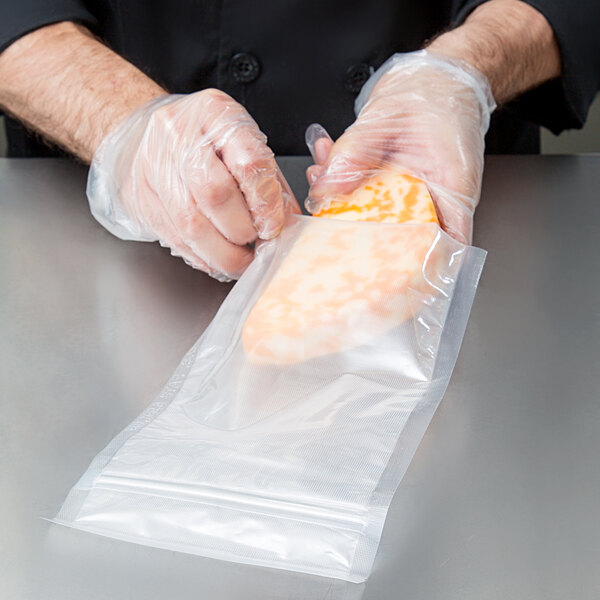 Keep food fresh five times longer than traditional storage methods with this ARY Vacmaster 948501 6" x 10" vacuum packaging bag! This pint size bag's full mesh design combines with an impressive 3 mil thickness to guarantee maximum freshness while eliminating the freezer burn and food dehydration often associated with long-term food storage. Thanks to a handy easy-open tear notch and recloseable zipper, this bag is an ideal solution for frequently opened items like cheese, deli meats, or chopped fruits and vegetables. Its reliable design safely accommodates boiling to make this versatile bag suitable for sous vide cooking and, for even greater convenience, it comes in a dispenser box for space-efficient storage and simple product retrieval!
